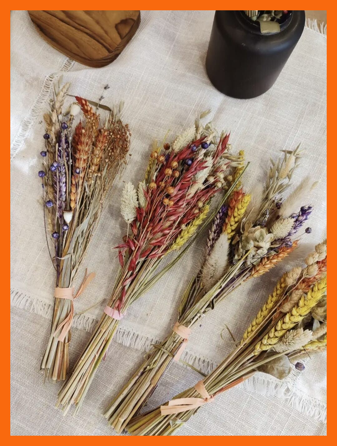Voeg kleur en warmte toe aan je interieur met deze prachtige, delicate handgemaakte droogbloemboeketten. Elk boeket is zorgvuldig samengesteld uit verschillende droogbloemen en daarom is elk boeket uniek.