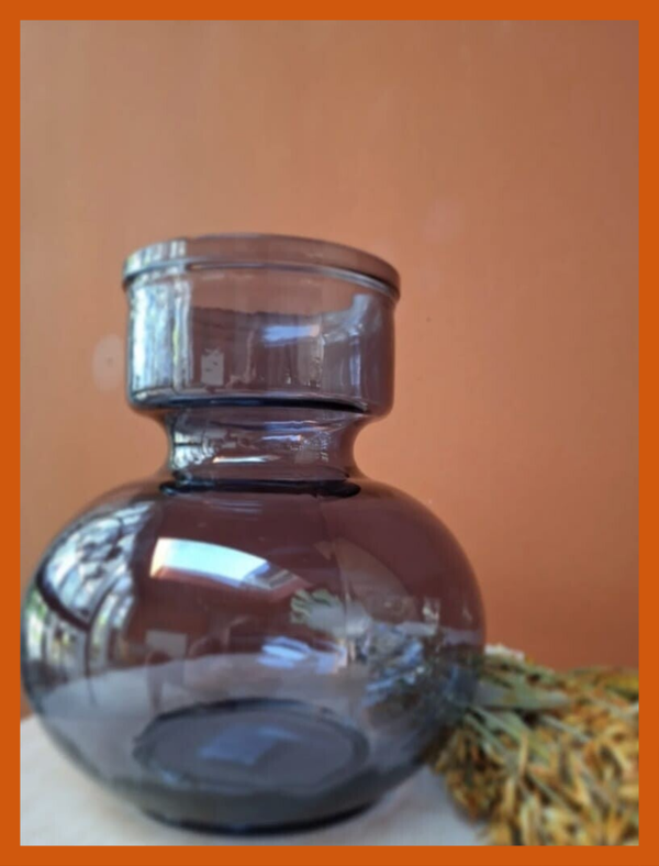Deze bolvormige vaas van gerecycled glas in een prachtige blauwgrijze tint is een ware eyecatcher voor elk interieur. De volle, ronde vorm en de brede nek geven de vaas een robuuste en elegante uitstraling, perfect voor het presenteren van je favoriete bloemen of takken. Het gerecycled glas voegt een duurzaam en uniek element toe, terwijl de subtiele kleur een rustgevende sfeer creëert. Deze vaas past zowel in een modern als een klassiek interieur en brengt een verfijnde, natuurlijke charme in je huis.