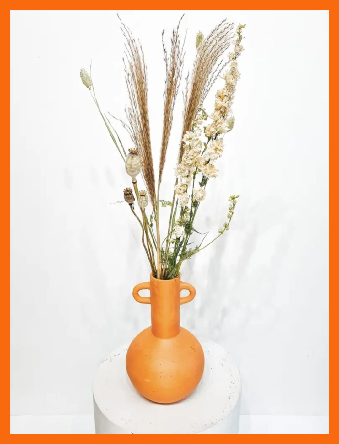 Deze handgemaakte terracotta vaas met dubbele oren combineert een elegante, slanke hals met een robuuste bolvorm. Perfect als decoratief object of voor enkele losse takken, en ideaal om een vleugje mediterrane sfeer toe te voegen aan je interieur.