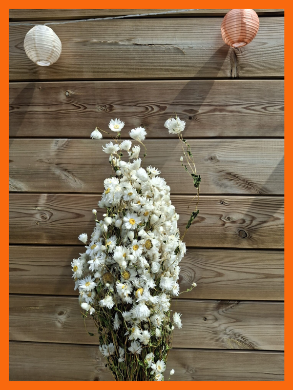 Voeg een vleugje rustieke charme toe aan je interieur met dit prachtige handgebonden boeket van gedroogde witte strobloemen. De bloemen zijn zorgvuldig geselecteerd en op natuurlijke wijze gedroogd, waardoor ze hun frisse witte kleur en delicate vorm behouden.