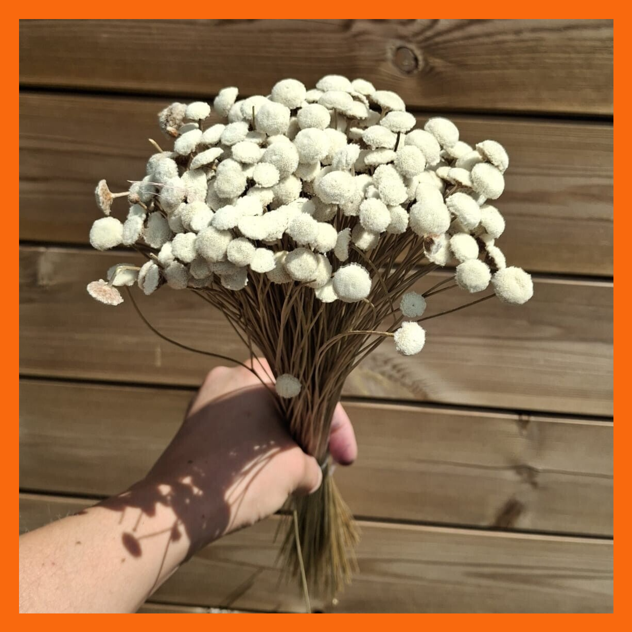 Voeg een speels én stijlvol element toe aan je droogbloemcreaties met deze prachtige bos Fluffy Buttons in zachte crèmekleur. De ronde, donzige bloemetjes lijken op kleine pompons en geven elk boeket een bijzondere textuur en natuurlijke uitstraling.