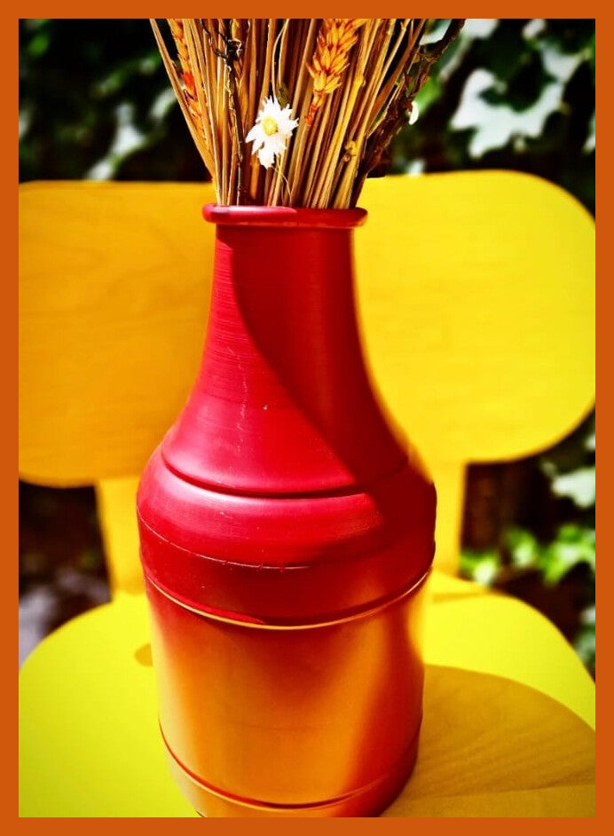 Dit vrolijk boeket vol gedroogde veldbloemen in zonnige tinten straalt pure zomer uit. Gecombineerd met een felrode metalen vaas wordt het een echte eyecatcher — perfect voor binnen of buiten.