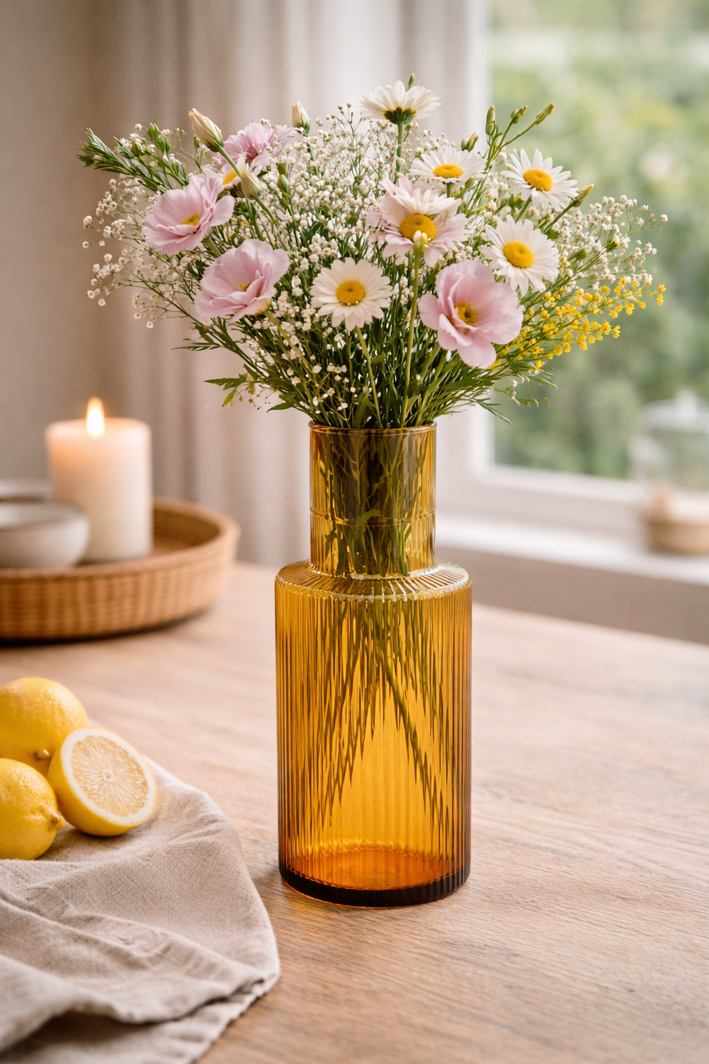 Deze hoge, elegante glazen karaf in een warme amberkleur brengt meteen een stijlvolle retro sfeer naar je tafel. De subtiele geribbelde textuur geeft de karaf een verfijnde uitstraling en zorgt tegelijk voor een comfortabele grip.