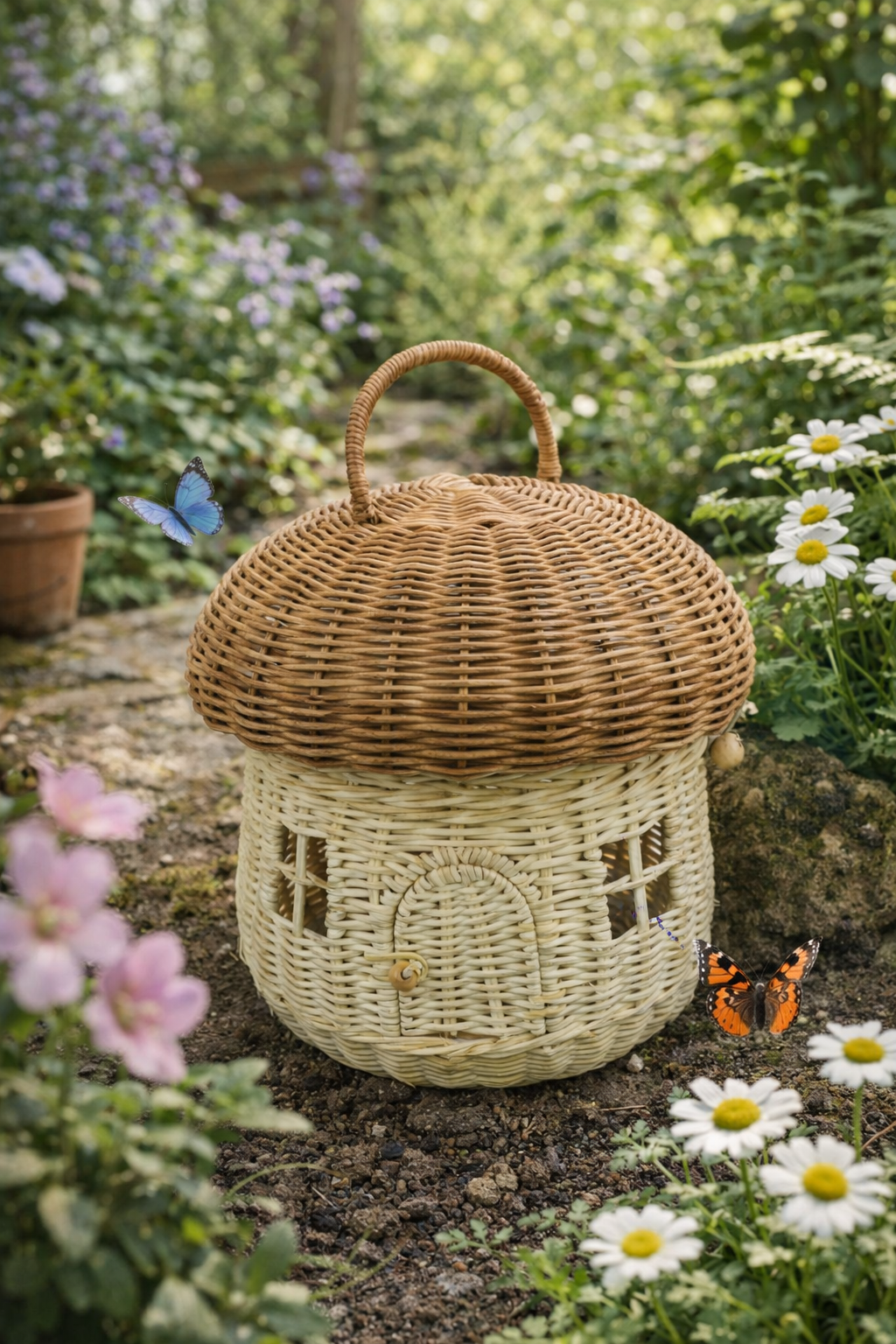 Decoratieve paddenstoelvormige mand, gemaakt van natuurlijke rotan. Het paddenstoelhuisontwerp maakt het een charmante decoratie voor het huis, de schuur of de tuin.